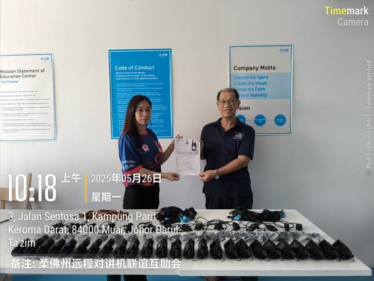 26/5/2025 ☞ 柔佛州远程对讲机联谊互助会活动主任陈成祖移交 25 台远程对讲机于第 40 届全国华人文化节麻坡首站筹委会秘书兼司仪杨珊珊